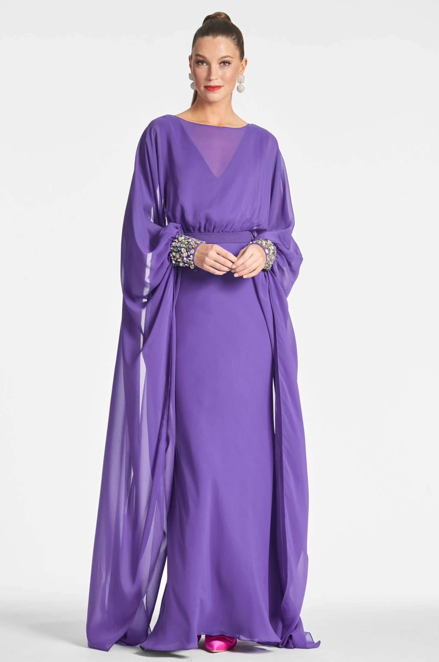 If you’re looking to turn heads, you’ve come to the right place. The Aphrodite gown in amethyst is solid chiffon with perfectly placed multicolor gems on each cuff. Featuring dramatic sleeves and a waist cinch, she’s all about the drama, keeping fit and sophistication at the forefront.