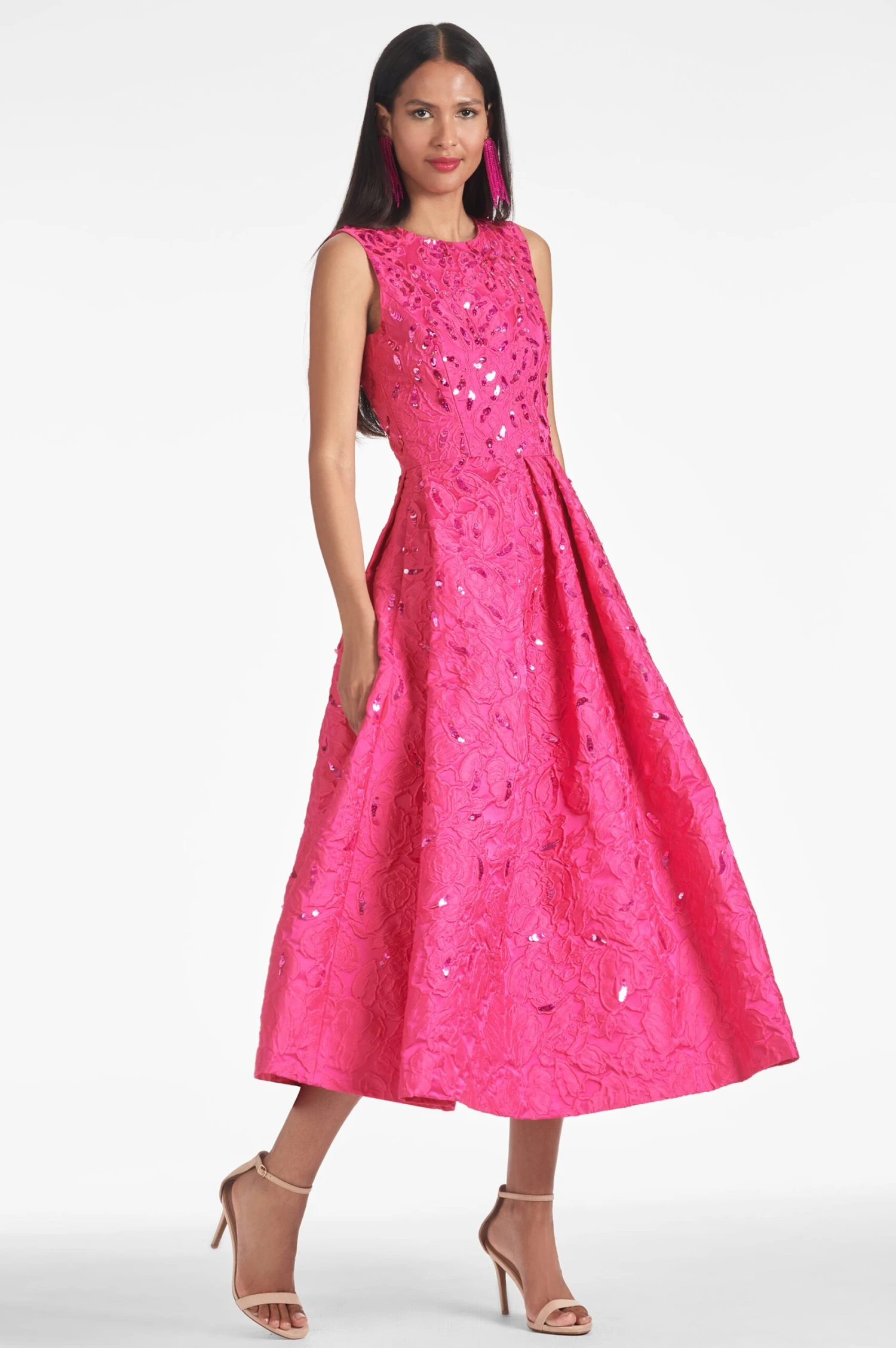 The Ashley Gown is perfect for any occasion. This tea-length silhouette flaunts in fuchsia and is sure to stand out. Comfortable and stylish, this sparkling gown will make heads turn. Ashley Gown is designed to flatter any figure. The eye-catching construction and comfortable fit make this gown a must-have for any wardrobe.