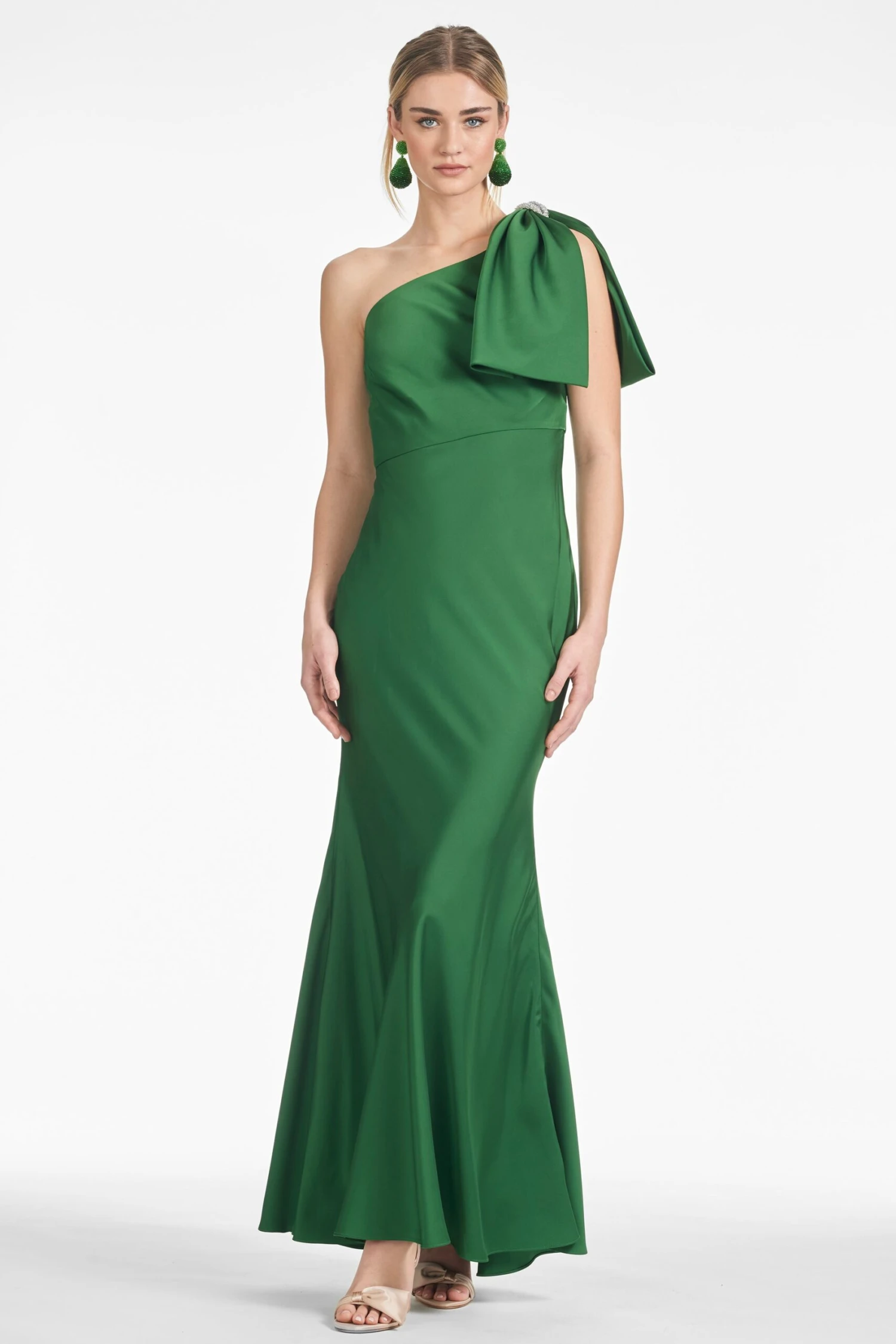 The Aubrey gown in emerald is an example of balance by design. A sleek sleeve of charmeuse cut on the bias with an asymmetric seam at the waist creates a column for curves. At the shoulder sits a hand tucked collapsed bow adorned with hand-embroidered silver caviar beading at the knot.