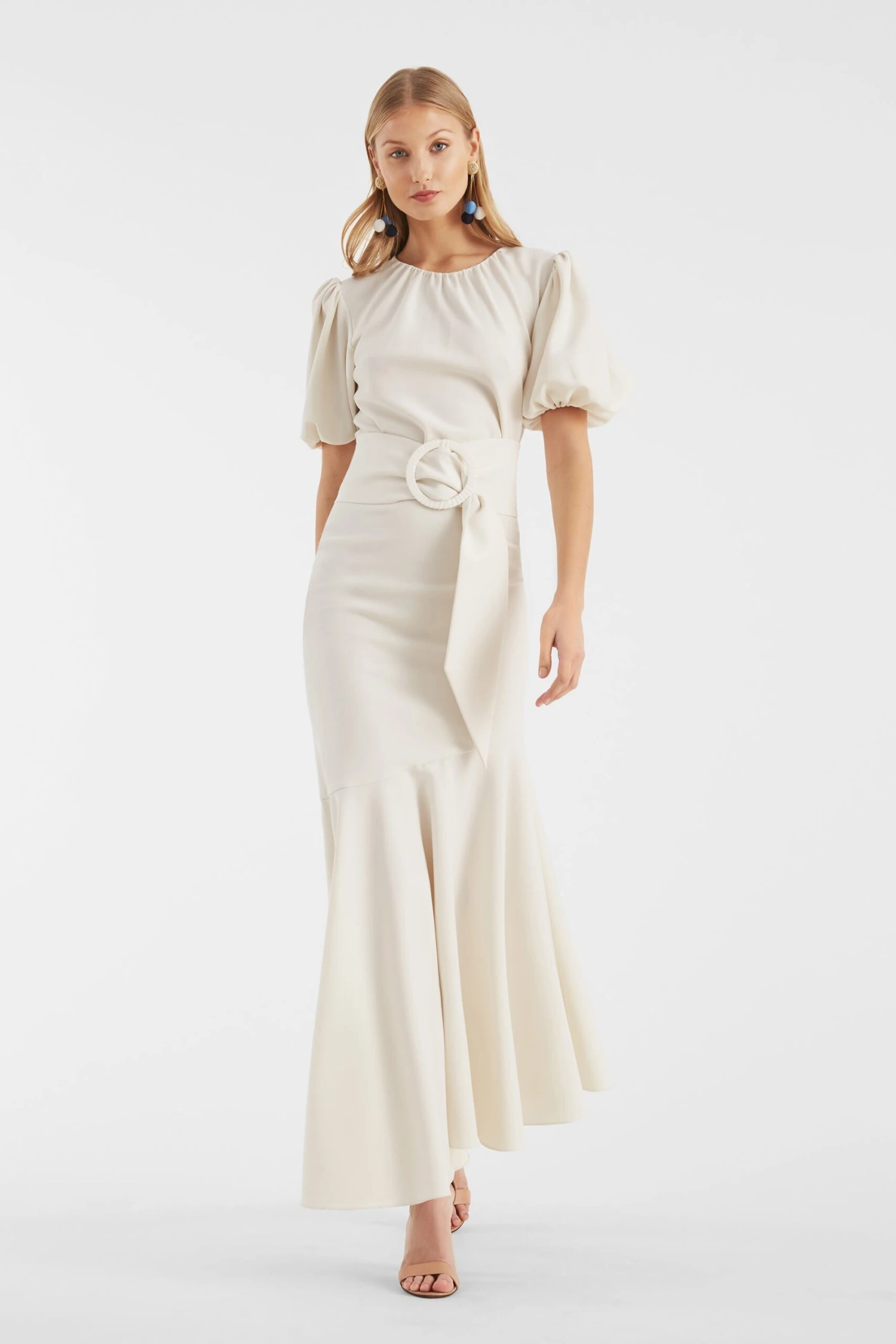 The Camilla dress in crepe is a modified mermaid silhouette perfect for day to evening. Ruching at the jewel neck creates a subtle blouson, and the bodice features a self-belt with hand wrapped buckle. Ruching is also seen at the side to hug the hip, falling away from the body with a fluid asymmetric hem.