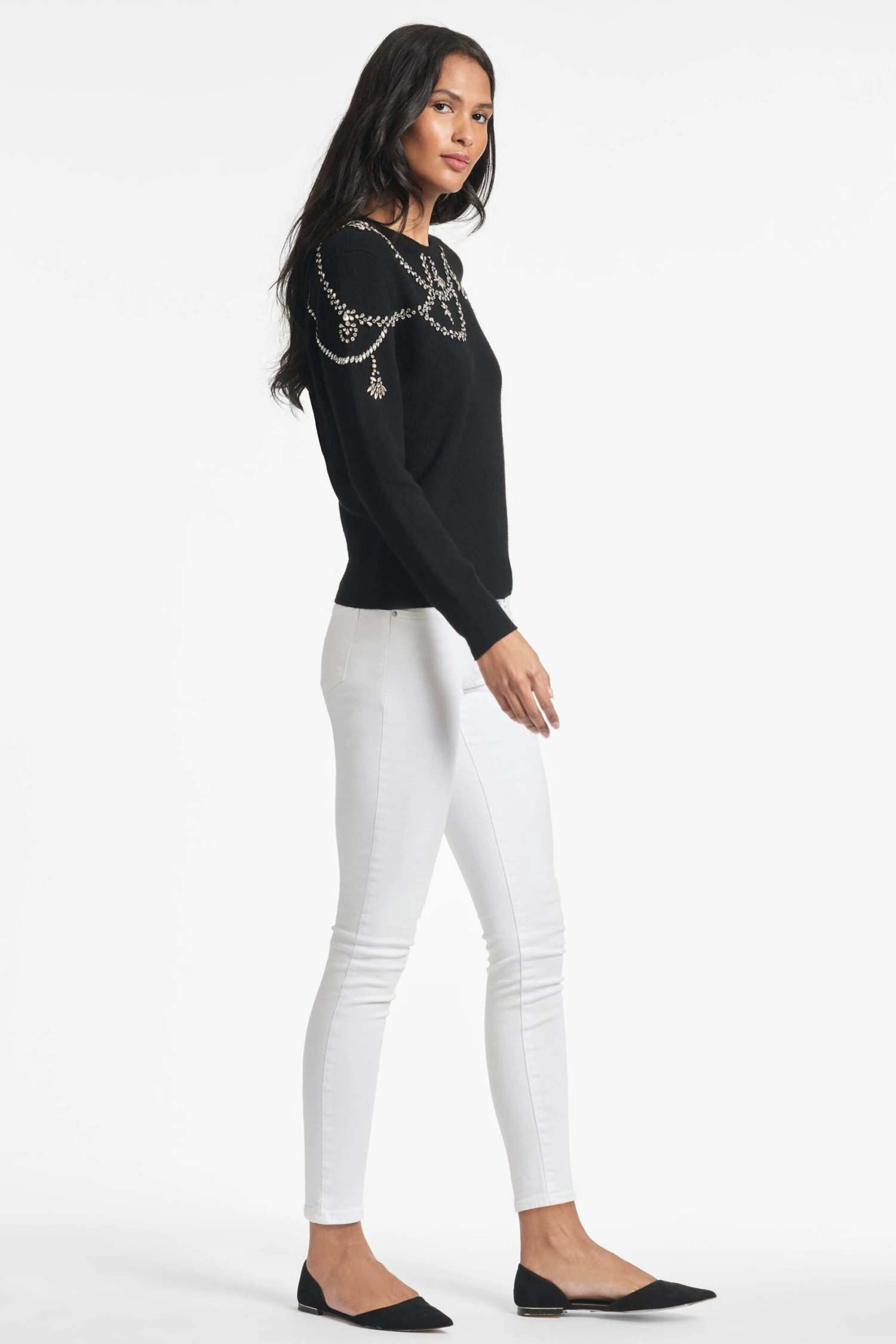 This is your occasion sweater, the one you pair back to your slinkiest sequin skirts, charmeuse wide-leg pants, or denim. An embellished chandelier-inspired crystal decoration appears perfectly beginning at the neckline and cascading down the shoulder. This elegant luxury knit is the ideal special sweater.