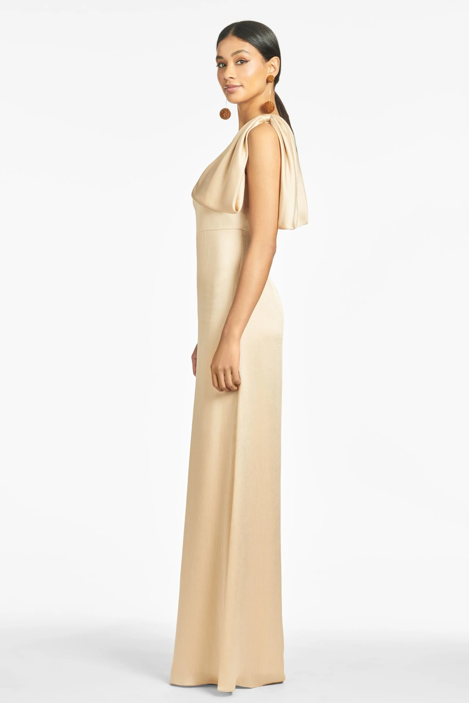 The Chelsea gown is an example of balance by design. A sleek sleeve of crinkle georgette is cut on the bias with an asymmetric seam at the waist, creating a column for curves. At the shoulder sits a hand-tucked, stitched-on collapsed bow. We design all of our Essential Social dresses with the intention that they can be enjoyed again and again. After all, a beautiful dress should be worn often and well.