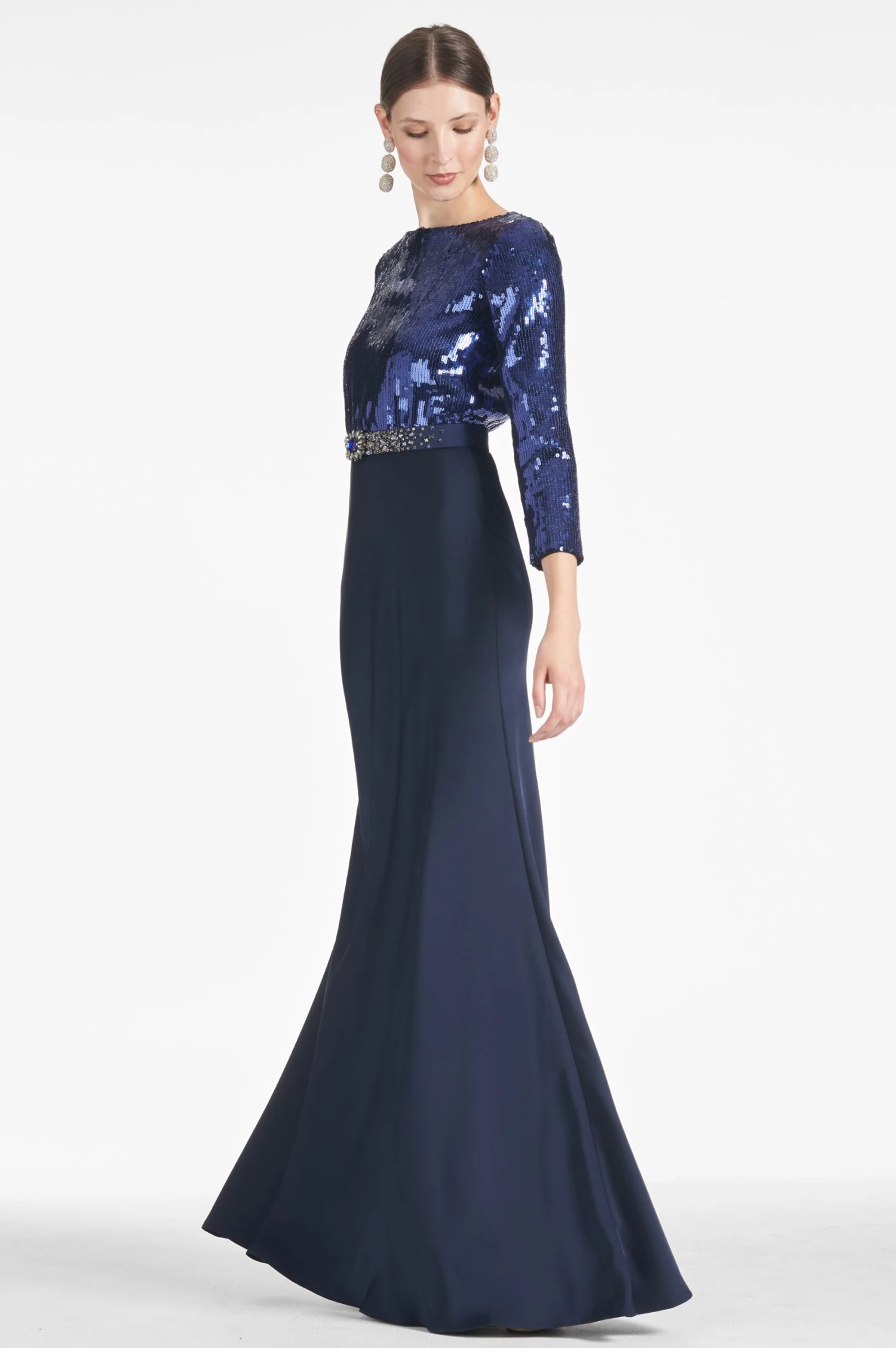 The Christabel Gown is the perfect choice for a look of classic elegance on the bottom and a festive touch on the top. Show off your unique style with the dress’ shimmering sapphire and midnight tones, and a glamorous touch with the embellished belt. Show your dazzling side with this perfect gown!