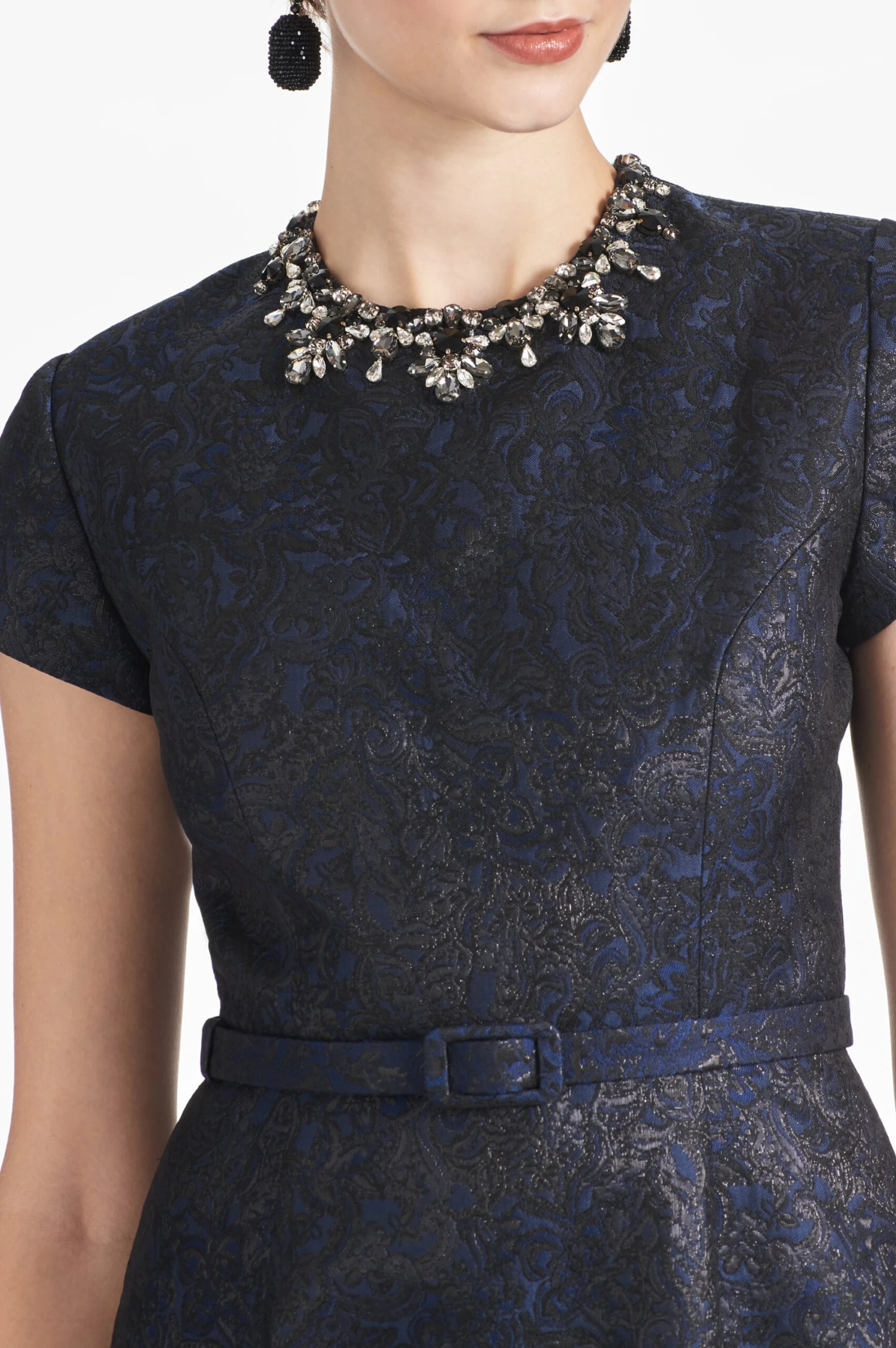 Be ready for any special occasion with the Fallon Dress. This elegant black and midnight dress features jacquard detailing and an adorned neckline. Embellishments and lace accents create a stunning, timeless, sophisticated look ideal for any mother of the bride or groom, or as a wedding guest.
