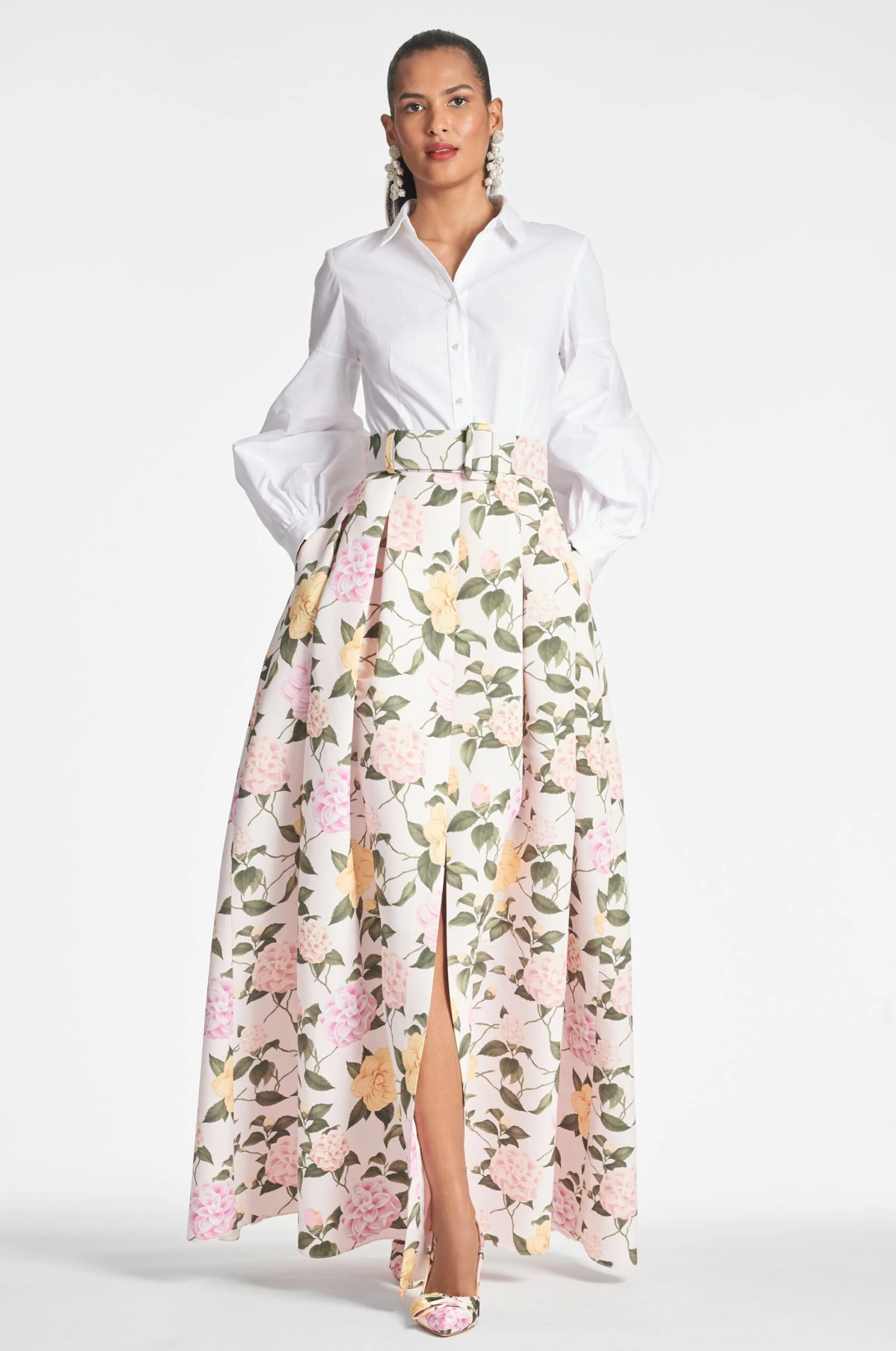Florence is classic. The Indian cotton bodice features a slight cut-away at collared neck, round pearl buttons down the center front, and lantern sleeve with invisible stitching to create that dramatic shape. The bottom of this gown is our Pink Lemonade Bouquet print, the colors inspired spring and summer when its in full bloom. The two pieces are met in the middle with a printed belt for a flattering, waist-cinching look.