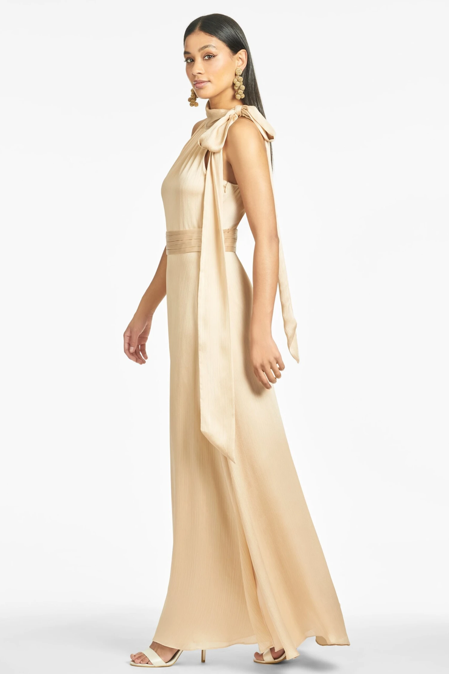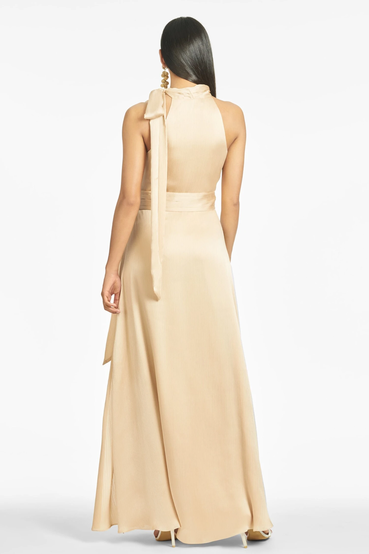 Kayla, simple yet romantic, is an elegant maxi dress with a self-tie at the neckline. The stitched-on pleated waistband hits at the true waist for the most flattering shape. We design all of our dresses in the Essential Social collection with the intention that they can be enjoyed again and again. A timeless dress should be worn often and well.