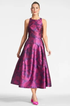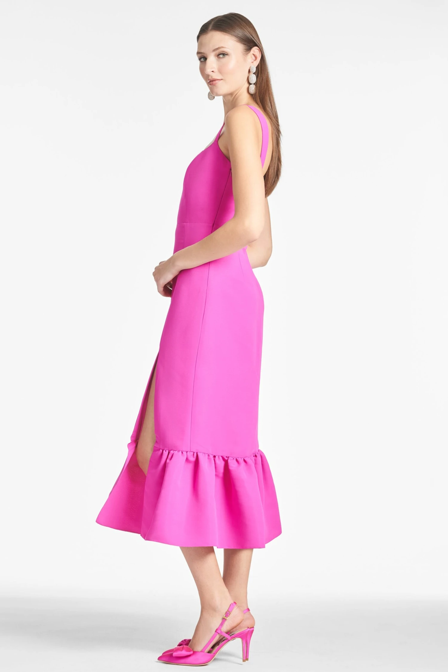 This is a shape that gives leading-lady, siren vibes. Sometimes the simplest things take the most time and engineering. This dress hugs and forgives in all the right places. Smocking at back allow for what feels and looks like a custom fit. Tapered straps top a trim sheath dress in cerise finished with an off-center slit.