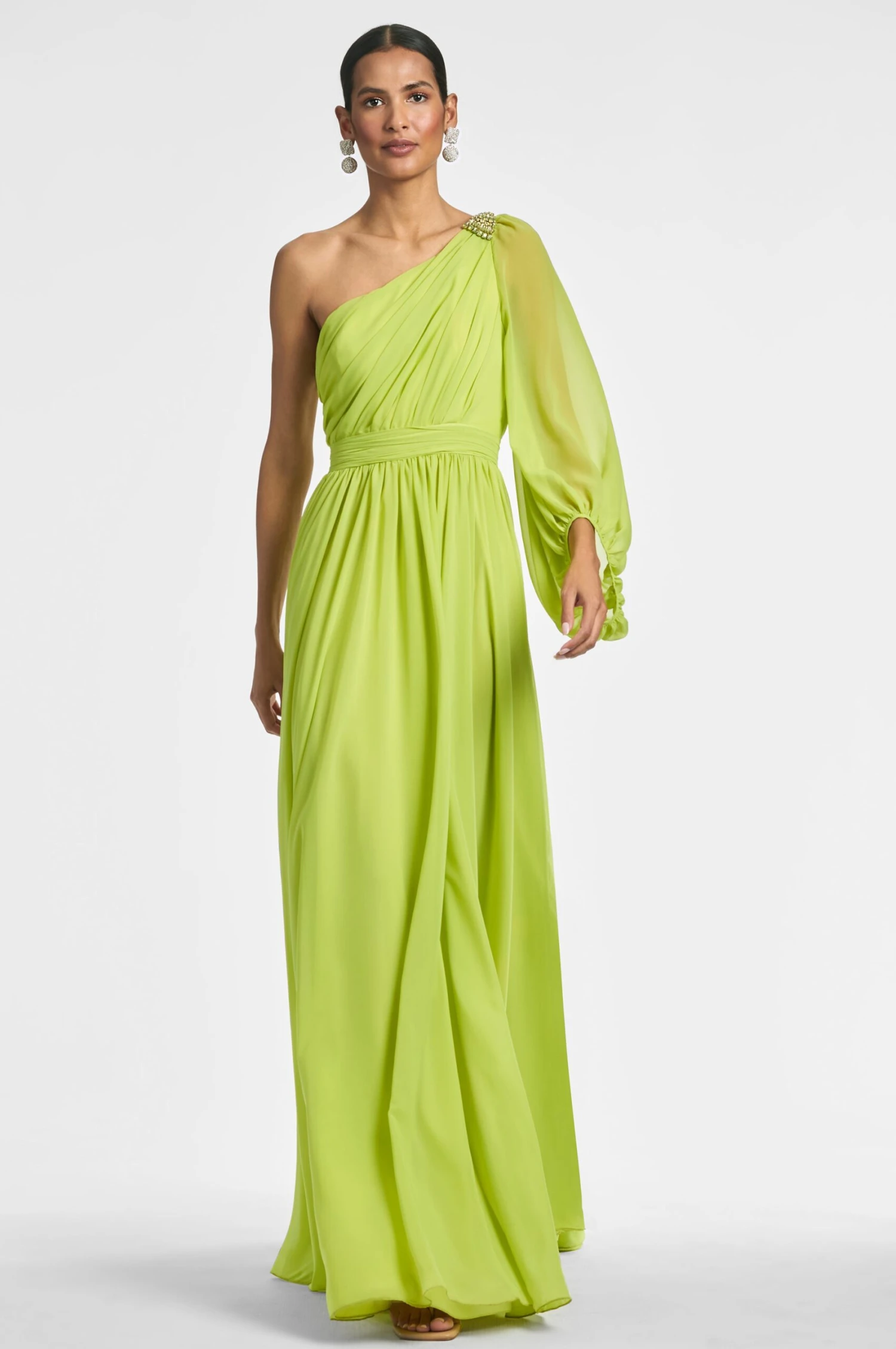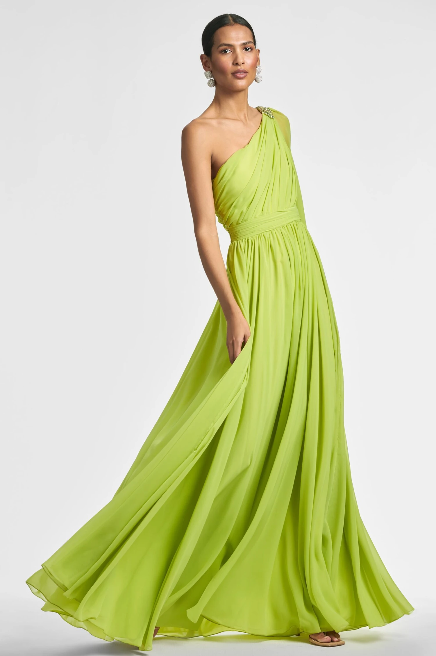 Make a statement in our Makayla Gown. Featuring a one-shoulder design and diagonal rouching at the bodice with a banded waist, this stunning chartreuse gown is perfect for any special occasion. The crystal-embellished broach adds a touch of glamour to complete the look.