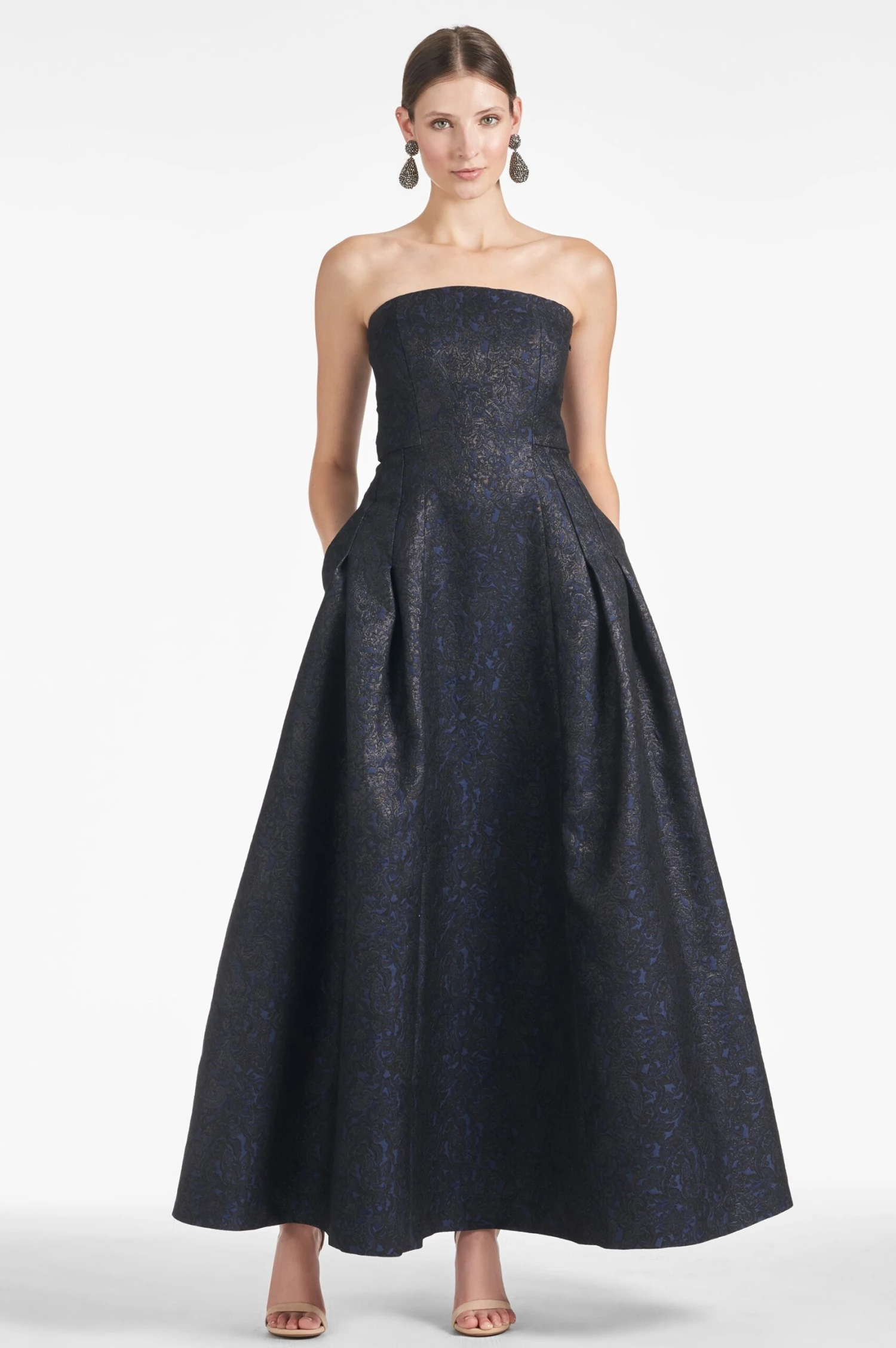 Our strapless ankle length party dress in black and midnight jacquard. With a bit of a surprise at the back, double band open back detail. A clean waist meets deep pleats allowing for a fabulous drape. Let’s not forget what we never do, pockets!