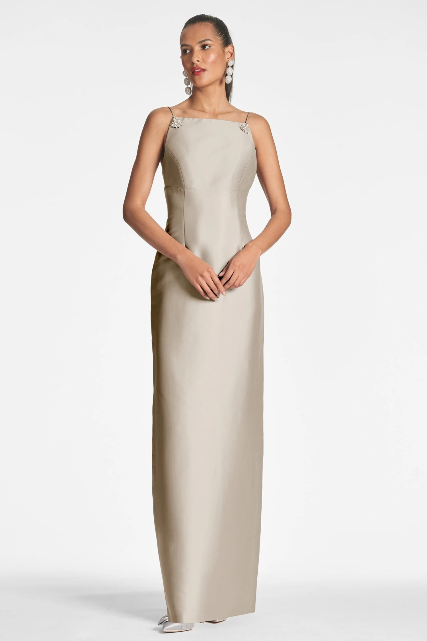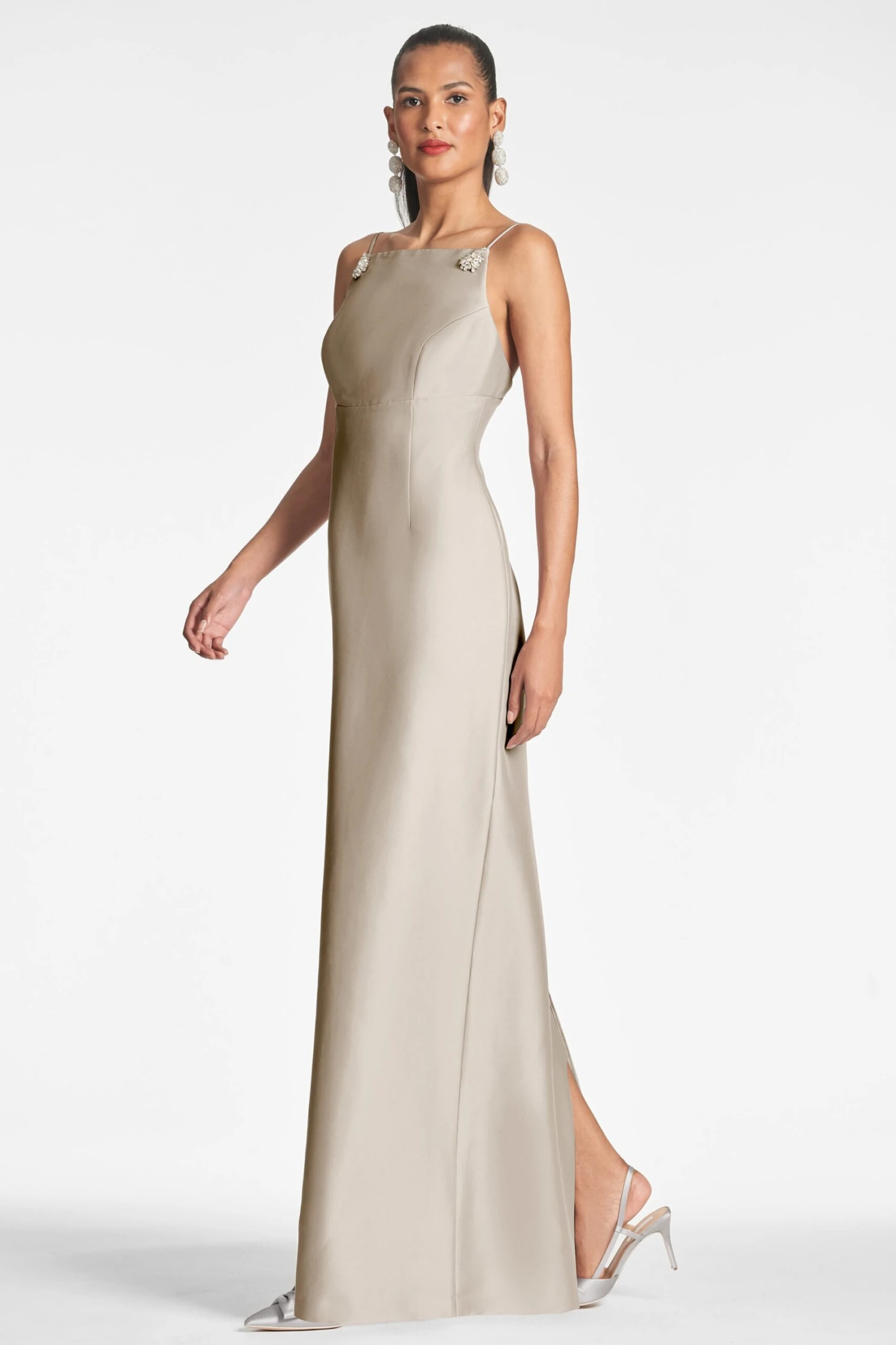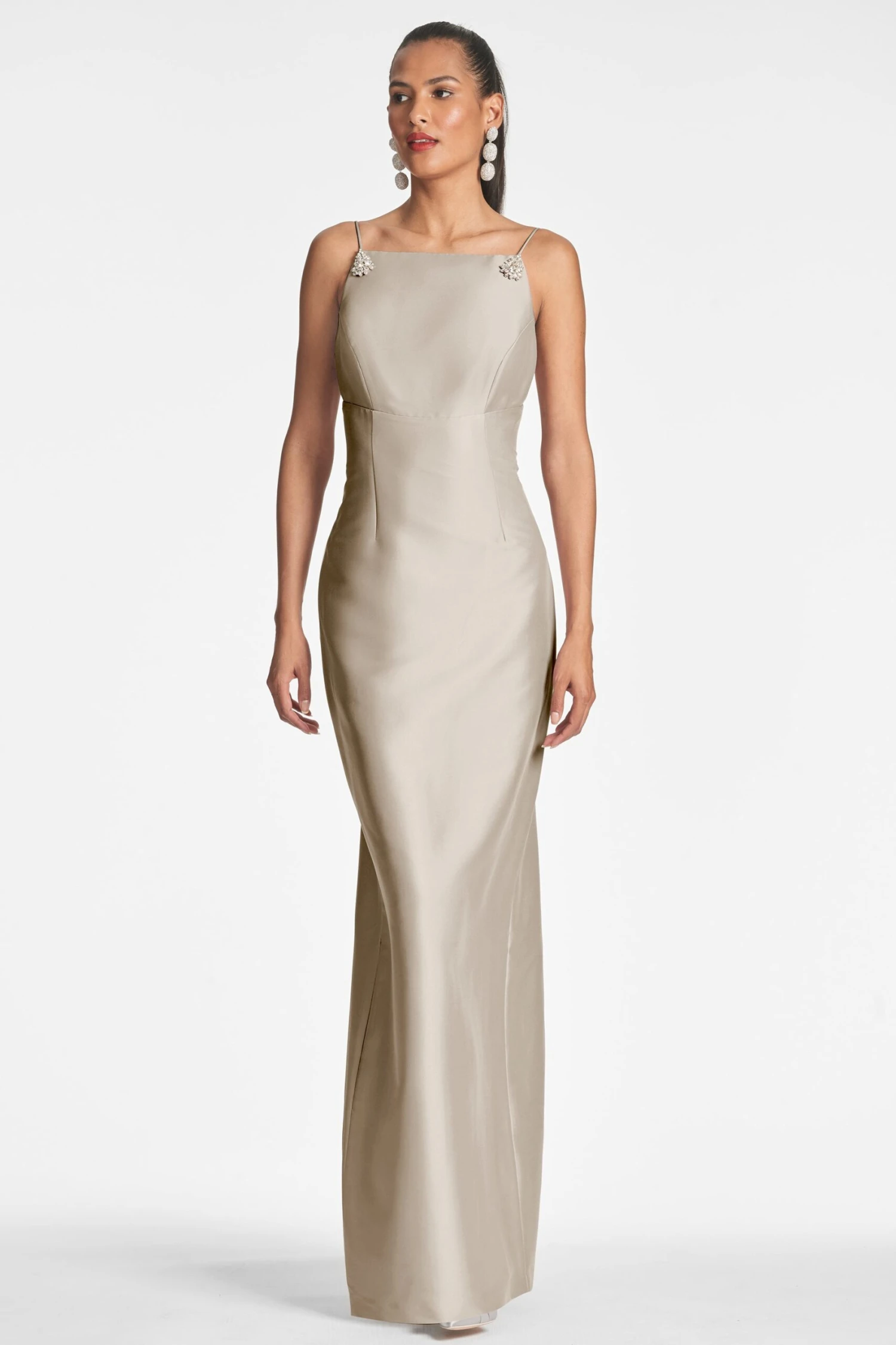 Sometimes the best answer is the most simple one, and that is true for the Pryce gown. A stunning column dress in stretch Mikado, she’s delicately adorned with crystal clips in our stunning Pewter.