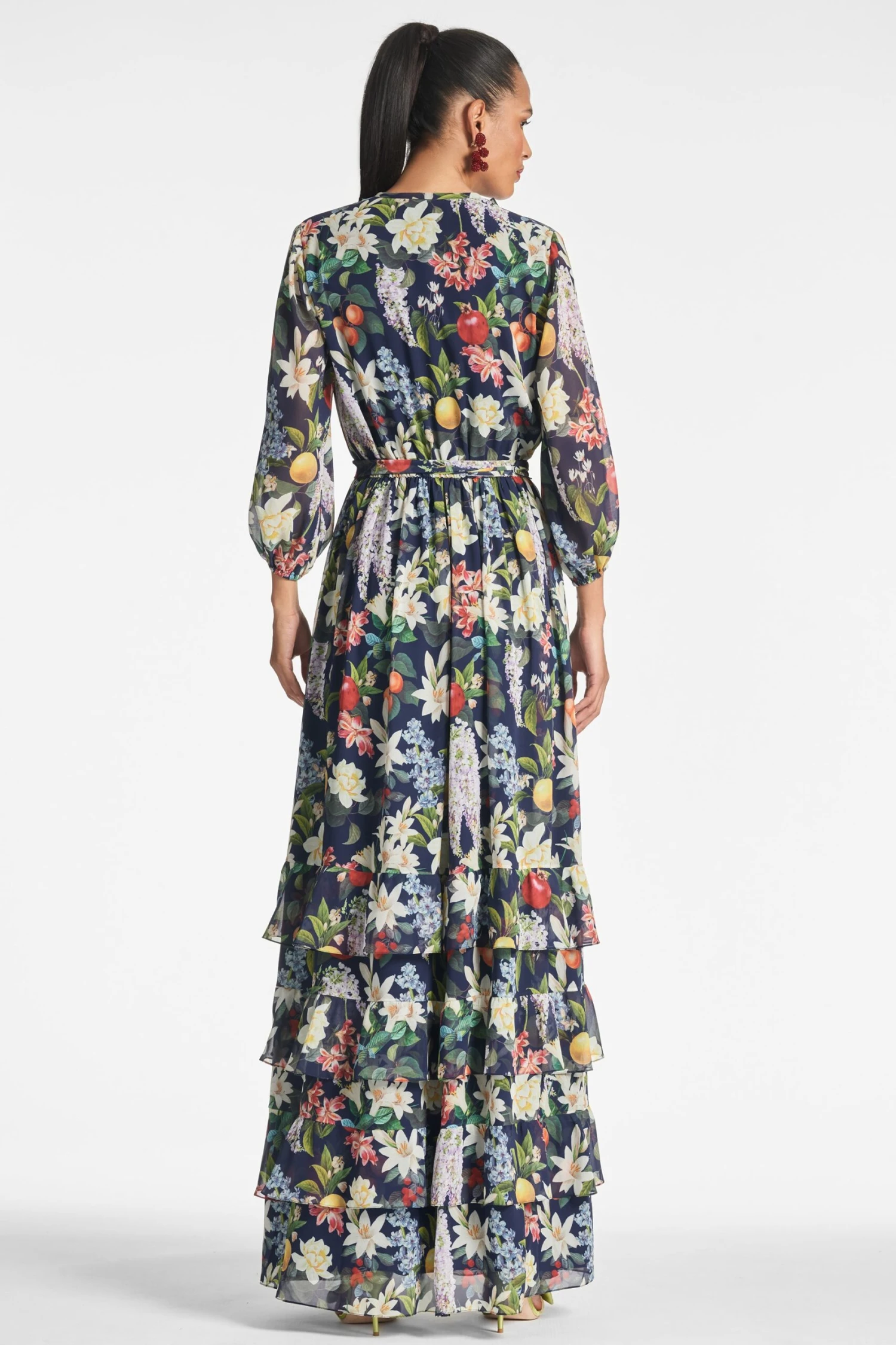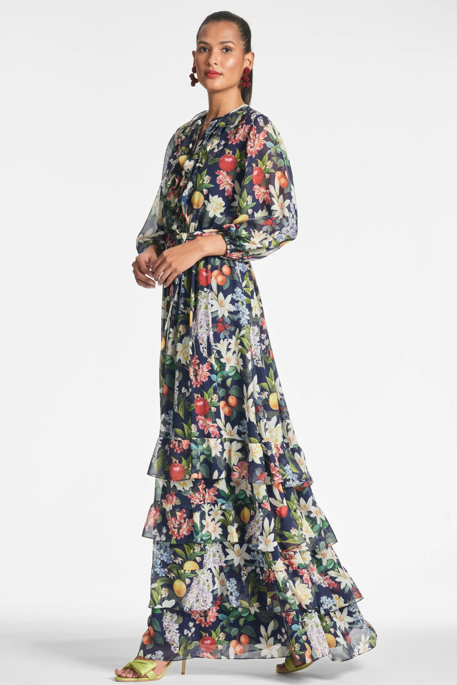 Prepare to make a statement in the Venus Gown in alto giardino. This printed chiffon piece is elegant yet modern, sophisticated yet flirty. She features sheer bubble sleeves, embellished front buttons with ruffles, and a self-tie complementary belt.