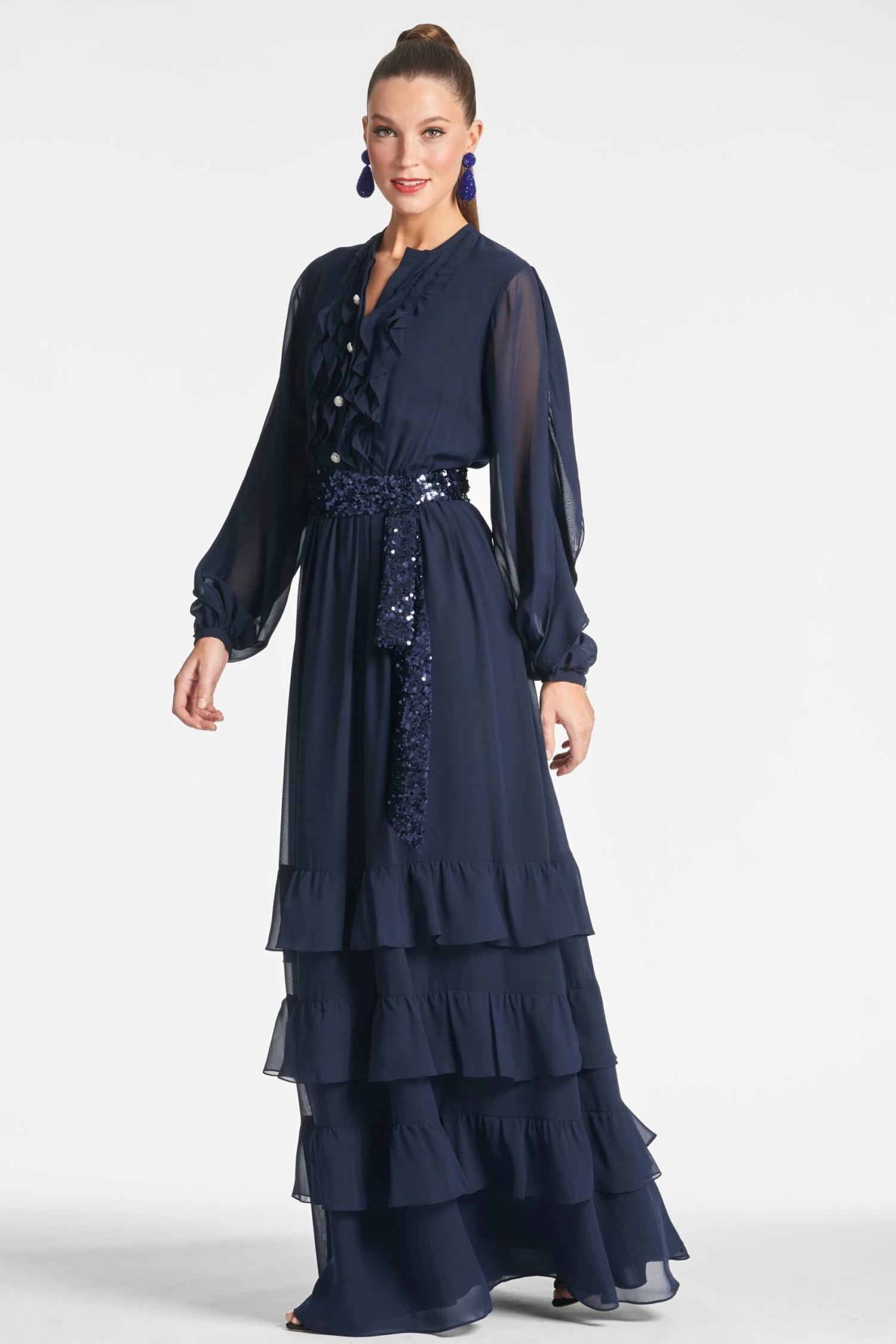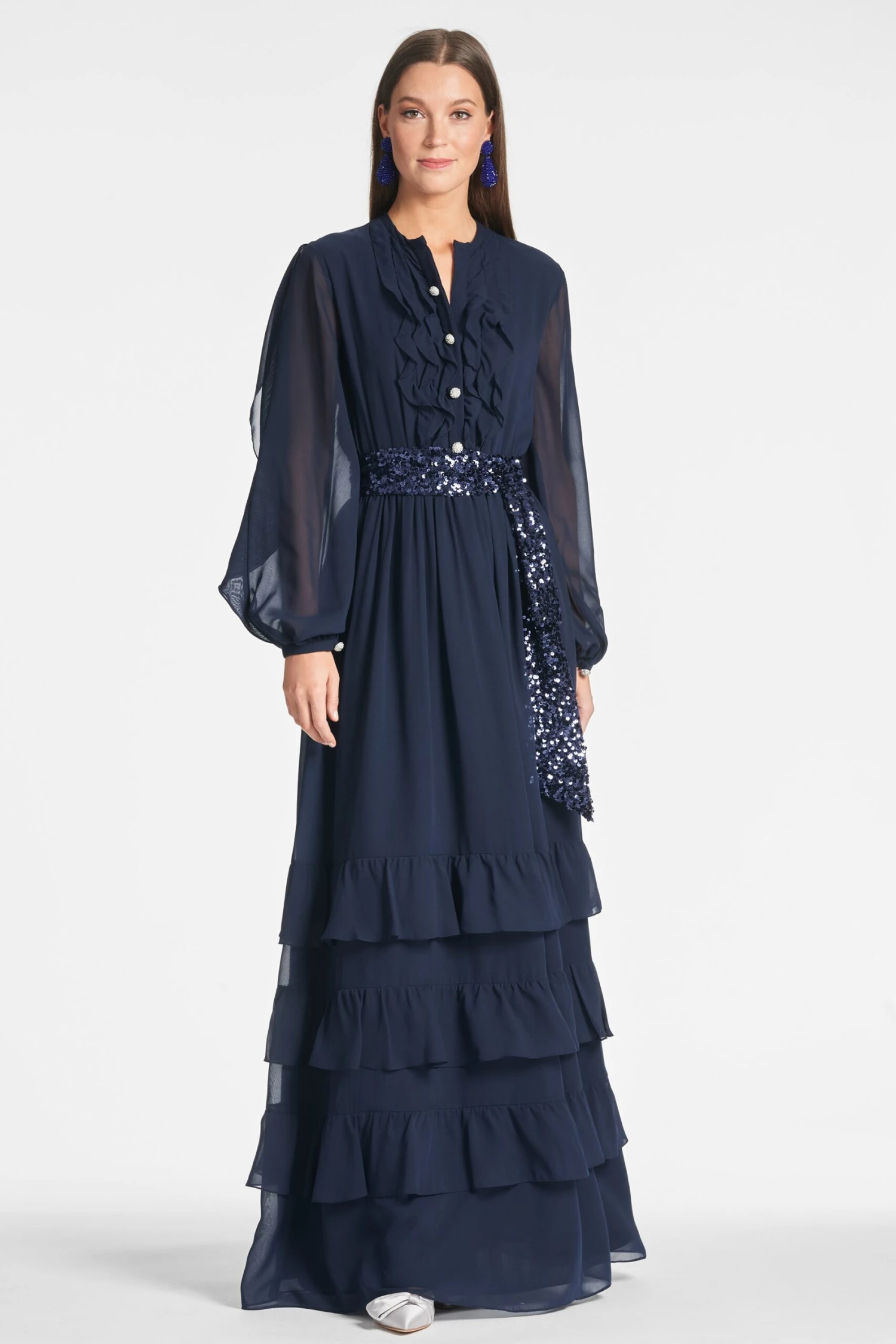 Prepare to make a statement in the Venus Gown in midnight. This solid chiffon piece is elegant yet modern, sophisticated yet flirty. She features sheer bubble sleeves, embellished front buttons with ruffles, and a self-tie complementary belt.