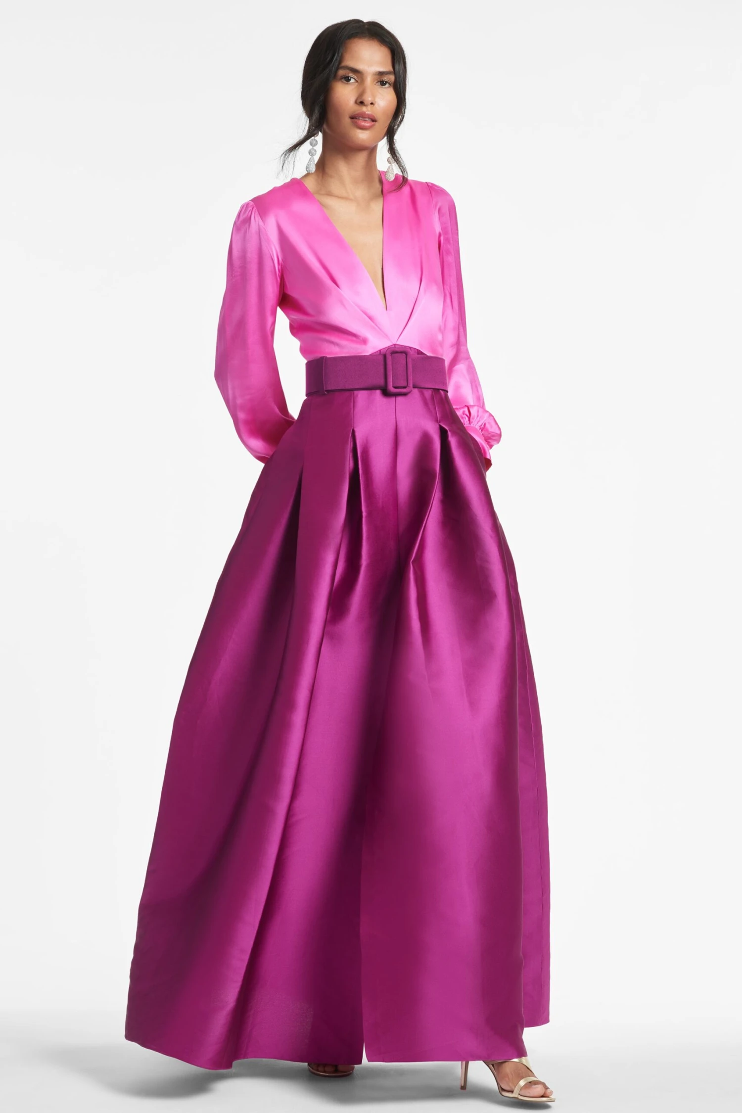 The Zoe Gown is the “Grande Dame” of the occasion. The deep V-neck pink satin crepe bodice meets the printed Mikado self-belt to join the classic ball skirt with its soft, box pleating. At the front a discreet, but still dramatic, front slit and at each side a side slit pockets.